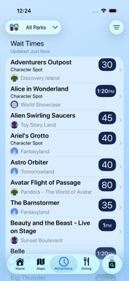 Designed for instant answers, not endless tapping. Park hours, wait times, and weather are right on your home screen — zero navigation needed. Maps show every attraction, restaurant, and restroom at a glance, with names right on the pins. No other app gives you this much information this fast.