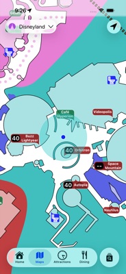 High-quality maps for Disneyland Park and Disney Adventure World. Every pin shows its name, type, and live wait time — attractions, restaurants, restrooms, and shops are all visible at once, no tapping required.