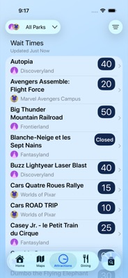 Crowd-sourced wait times updated throughout the day. Sort by time, park, proximity, or your favorites. Mark your must-do attractions and get wait-time alerts when queues drop.