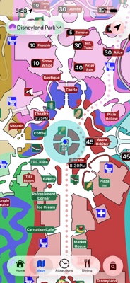 High-quality maps for Disneyland Park and Disney California Adventure. Every pin shows its name, type, and live wait time — attractions, restaurants, restrooms, and shops are all visible at once, no tapping required.