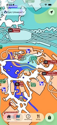High-quality maps for Universal Studios Florida, Islands of Adventure, and Epic Universe. Every pin shows its name, type, and live wait time — attractions, restaurants, restrooms, and shops are all visible at once, no tapping required.