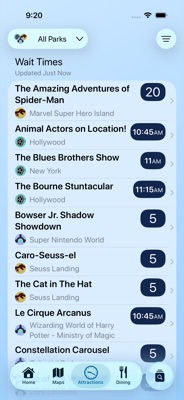 Crowd-sourced wait times updated throughout the day. Sort by time, park, proximity, or your favorites. Mark your must-do attractions and get wait-time alerts when queues drop.